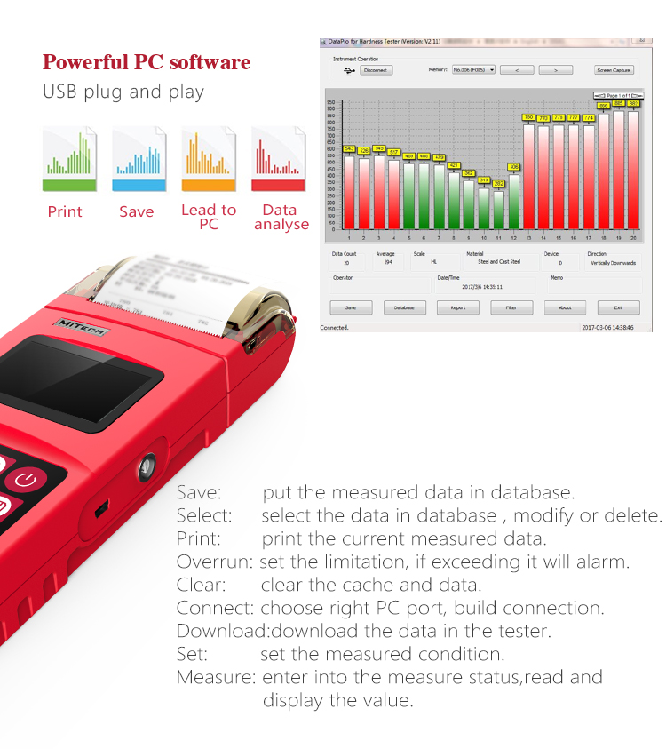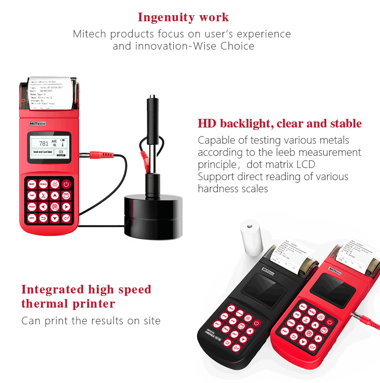 Product OverviewMH320 portable Leeb hardness tester is based on Leeb hardness measurement principle, it can be quickly and easily used for on-site testing hardness of metallic materials and support free conversion between Leeb, Brinell, Rockwell hardness and other scales. It uses 128 × 64 dot matrix LCD screen, rich information, intuitive, stable performance and integrated high-speed thermal printer, which enables printing with instant measurement results.It can be widely used in metal processing and manufacturing, special equipment, permanent component failure analysis, inspection and other fields. It is particularly suitable for large parts and non-removable part of the on-site hardness testing. It is to improve production efficiency and pass rate and is a wise choice to save the cost of production.