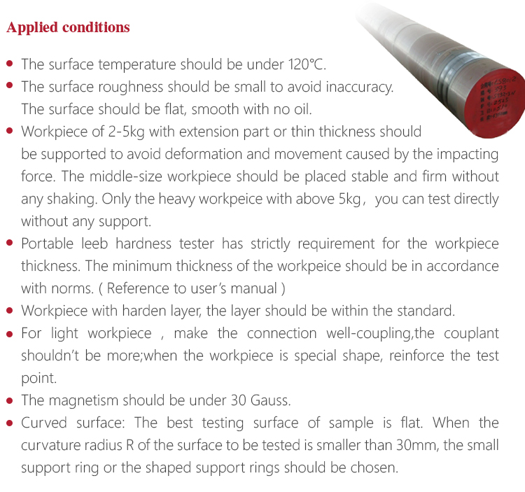 ---- If want accurate conversion from the Leeb hardness value to other hardness value, contrastive test is needed to get conversion relations for the special material. Use inspection qualified Leeb hardness tester and corresponding hardness tester to test at the same sample respectively. For each hardness value, each measure homogeneously 5 points of Leeb hardness value in the surrounding of more than three indentations which need conversion hardness, using Leeb hardness arithmetic average value and corresponding hardness average value as correlative value respectively, make individual hardness contrastive curve. Contrastive curve at least should include three group of correlative data.