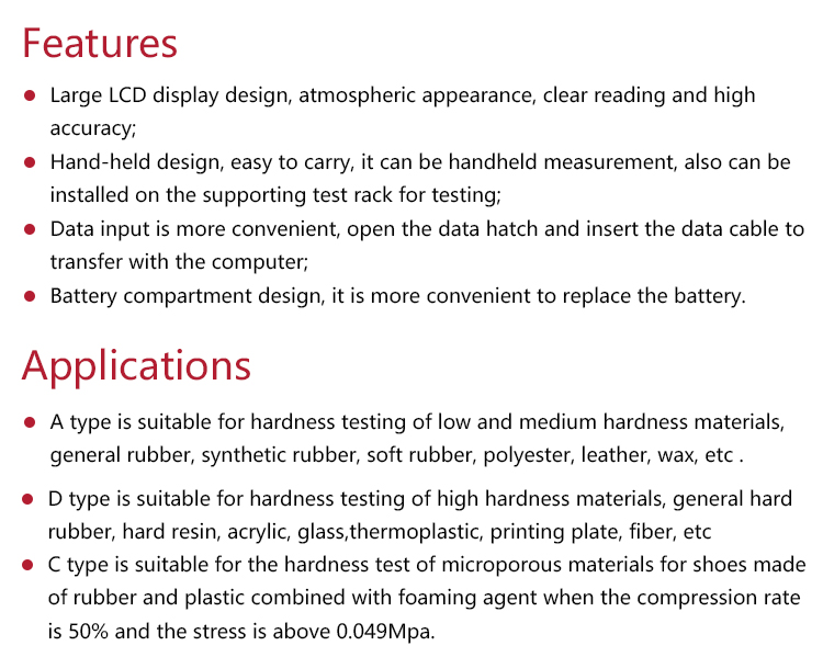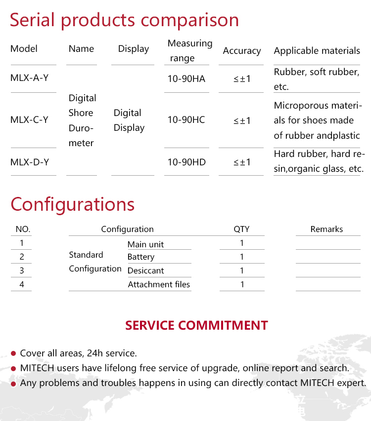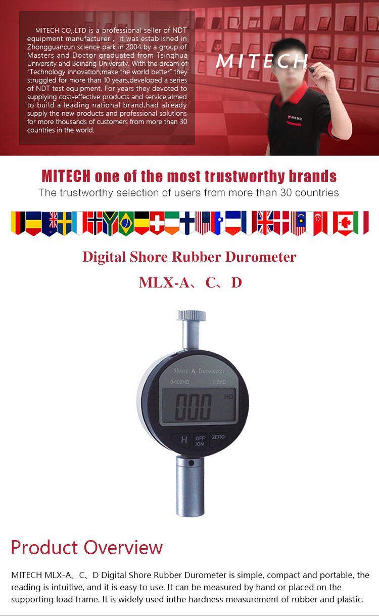 Product OverviewMITECH MLX-A、C、D Digital Shore Rubber Durometer is simple, compact and portable, the reading is intuitive, and it is easy to use. It can be measured by hand or placed on the supporting load frame. It is widely used in the hardness measurement of rubber and plastic.