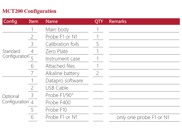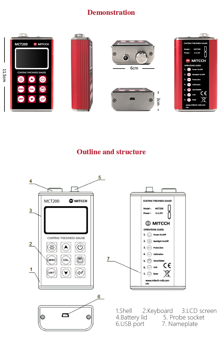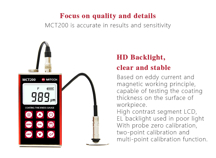 Product OverviewMCT200 Coating Thickness Gauge is designed for non-destructive, fast and precise coating thickness measurement and also can measure the film thickness. It is widely used in manufacturing,metal processing industry, chemical industry.commodities inspection and other testing areas. Measuring range from 0 to 10 mm, can meet the different industries in view of the workpiece surface coating thickness testing requirements. It is the necessary professional precision instrument to improve the production efficiency and the qualified rate, saving the cost of production.