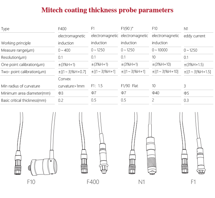 Instrument FeaturesFive types of probes(F400,F1, F10,N1,CN02) are available for different applications, F10 probe measures up to 10mm.