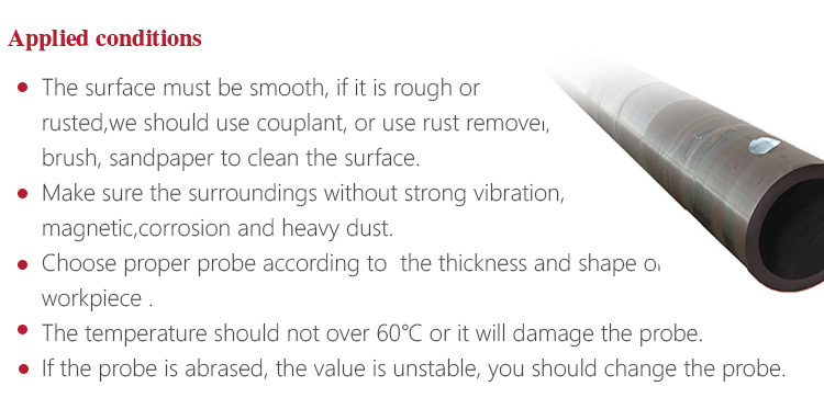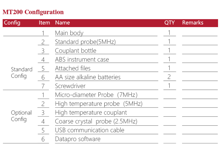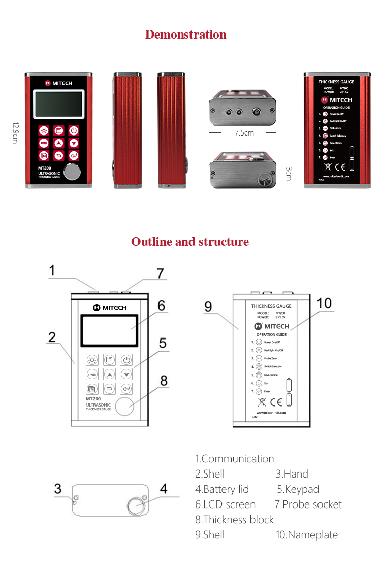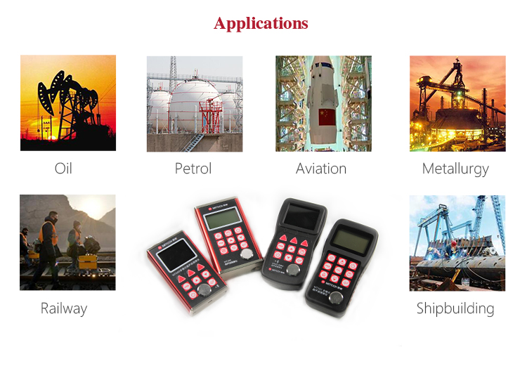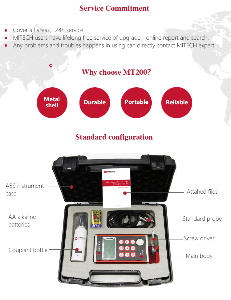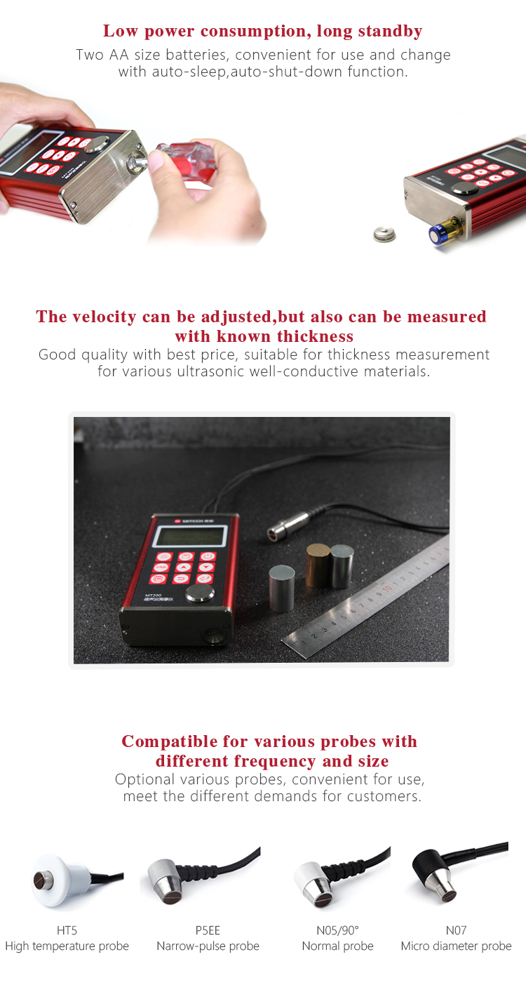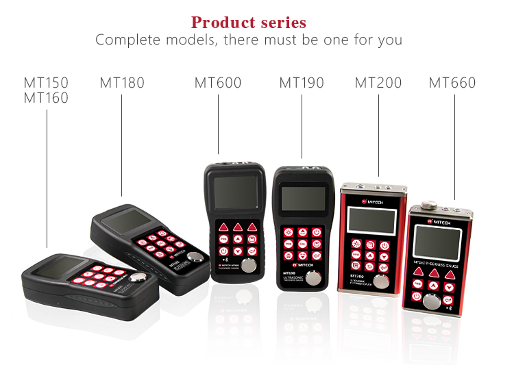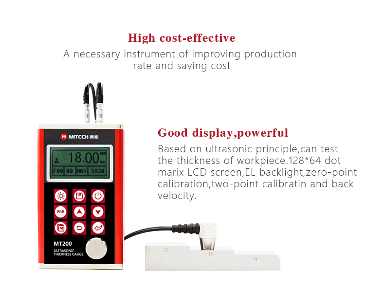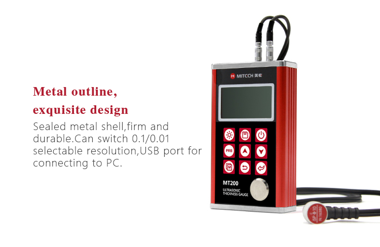 Product OverviewThe model MT200 is a digital ultrasonic thickness gauge. Based on the ultrasonic principle , the instrument is capable of measuring the thickness of various materials, such as metal, plastics, ceramic, glass and many other good ultrasonic conductors. It can also measure the velocity of all kinds of materials. Compared with the traditional measurement methods, the advantages of ultrasonic thickness gauge is exposed to one side of the workpiece to complete the measurement. Its unique non-destructive testing performance provide the perfect solution for the thickness testing of closed pipes, containers, etc. It is widely used in petroleum, chemical, metallurgy, shipbuilding, aviation, aerospace and other fields because of monitoring corrosion thinning degree of various pipes and pressure vessels.It can also be used for precise measurement of sheet metal and machined parts.