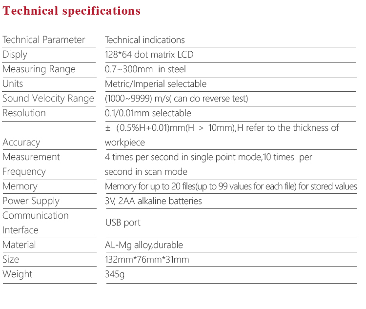 | Accuracy | ±(0.5%Thickness+0.04)mm,depends on probes |