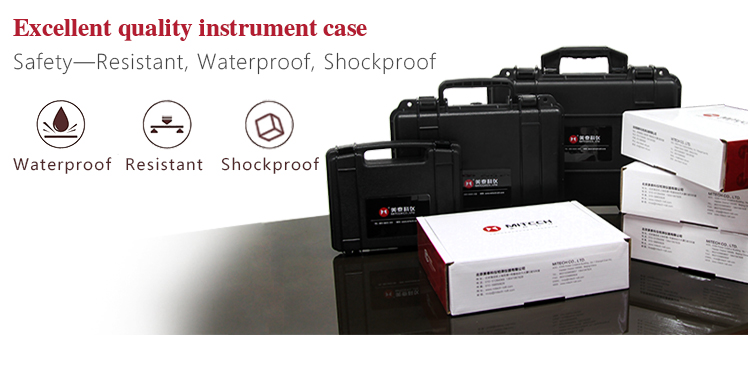 The instrument case of Mitech ultrasonic thickness gauge, length: 27cm, width: 22.5cm, height: 7.5cm and weight: 0.698kg, designed with ABS engineering plastic, It has excellent performance like waterproof, shockproof, excellent heat resistance and low temperature resistance. It can effectively prevent oil, dust and corrosion in harsh environment. Its size in line with the standards for aviation and train carrying (capable of putting under the seat and on the luggage rack), it is safe, reliable and stable.