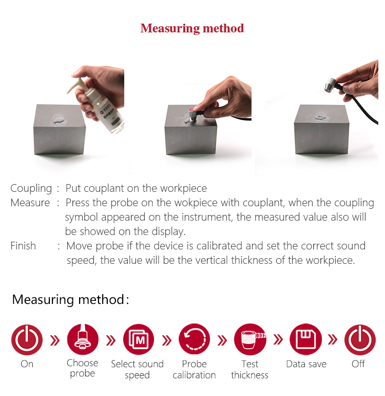 The velocity of sound through a substance is dependant upon its temperature. As materials heat up, the velocity of sound through them decreases. In most applications with surface temperatures less than about 100℃, no special procedures must be observed. At temperatures above this point, the change in sound velocity of the material being measured starts to have a noticeable effect upon ultrasonic measurement. At such elevated temperatures, it is recommended that the user perform a calibration procedure on a sample piece of known thickness, which is at or near the temperature of the material to be measured. This will allow the gauge to correctly calculate the velocity of sound through the hot material.