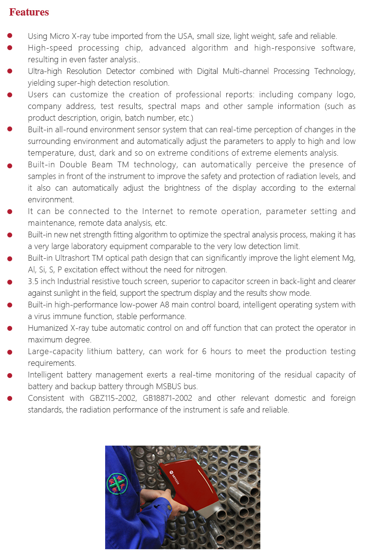 Instrument Featuresl Using Micro X-ray tube imported from the USA, small size, light weight, safe and reliable.