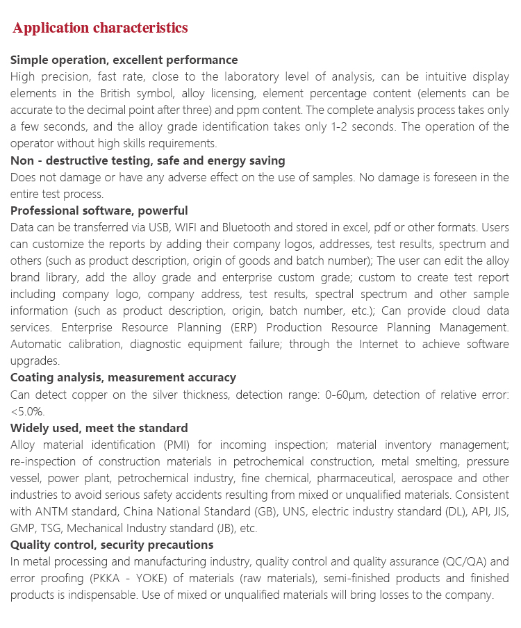 | Applicable materials | For the detection of iron-based alloy series(Stainless steel, chrome / molybdenum alloy steel, low a |