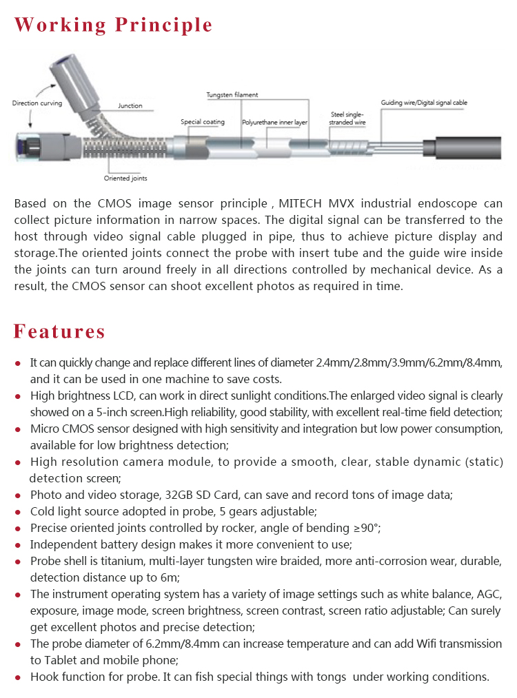 Product OverviewMITECH MVX series of industrial endoscope, based on the CMOS image sensor principle, can realize image shooting in the pipe or narrow area which can not be directly observed. And the results can be displayed with high-definition ,so as to achieve non-destructive testing. MITECH MVX series endoscope is a high-precision video electronics industry endoscope, the use of color LCD display and highly integrated CMOS image sensor to ensure that the video endoscopic image of the clear, realistic; its low power consumption, quick signal transmission speed , and easy to carry,operate, different diameter testing lines can be replaced to achieve multi-purpose use and cost saving. It can detect pipe or narrow spaces without tearing apart or damaging machine while not working.Cracks, welds, foreign body, wear and internal processing of parts and other circumstances can be detected with high quality images. It is widely used in aerospace, petrochemical, mechanical casting, national defense military, power production, automobile transportation and other fields, and is the important detection and monitoring equipment of industrial equipment testing and maintenance and other aspects.