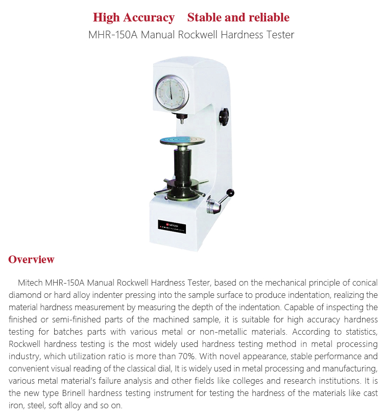 Product OverviewMitech MHR-150A Manual Rockwell Hardness Tester, based on the mechanical principle of conical diamond or hard alloy indenter pressing into the sample surface to produce indentation, realizing the material hardness measurement by measuring the depth of the indentation. Capable of inspecting the finished or semi-finished parts of the machined sample, it is suitable for high accuracy hardness testing for batches parts with various metal or non-metallic materials. According to statistics, Rockwell hardness testing is the most widely used hardness testing method in metal processing industry, which utilization ratio is more than 70%. With novel appearance, stable performance and convenient visual reading of the classical dial, It is widely used in metal processing and manufacturing, various metal material’s failure analysis and other fields like colleges and research institutions. It is the new type Brinell hardness testing instrument for testing the hardness of the materials like cast iron, steel, soft alloy and so on.