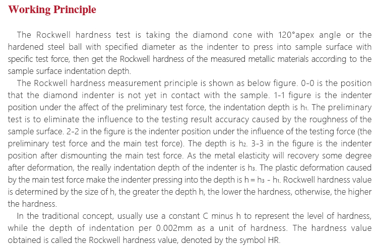 The Rockwell hardness measurement principle is shown as below figure. 0-0 is the position that the diamond indenter is not yet in contact with the sample. 1-1 figure is the indenter position under the affect of the preliminary test force, the indentation depth is h1. The preliminary test is to eliminate the influence to the testing result accuracy caused by the roughness of the sample surface. 2-2 in the figure is the indenter position under the influence of the testing force (the preliminary test force and the main test force). The depth is h2. 3-3 in the figure is the indenter position after dismounting the main test force. As the metal elasticity will recovery some degree after deformation, the really indentation depth of the indenter is h3. The plastic deformation caused by the main test force make the indenter pressing into the depth is h=h3-h1. Rockwell hardness value is determined by the size of h, the greater the depth h, the lower the hardness, otherwise, the higher the hardness.