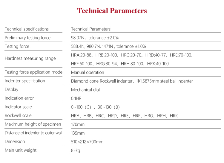 | Indenter specification | Diamond cone Rockwell indenter,Φ1.5875mm steel ball indenter |