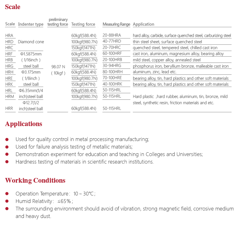 | Hardness Measuring range | HRA:20-88、HRB:20-100、HRC:20-70、HRD:40-77、HRE:70-100、 HRF:60-100、HRG:30-94、HRH:80-100、HRK:40-100 |