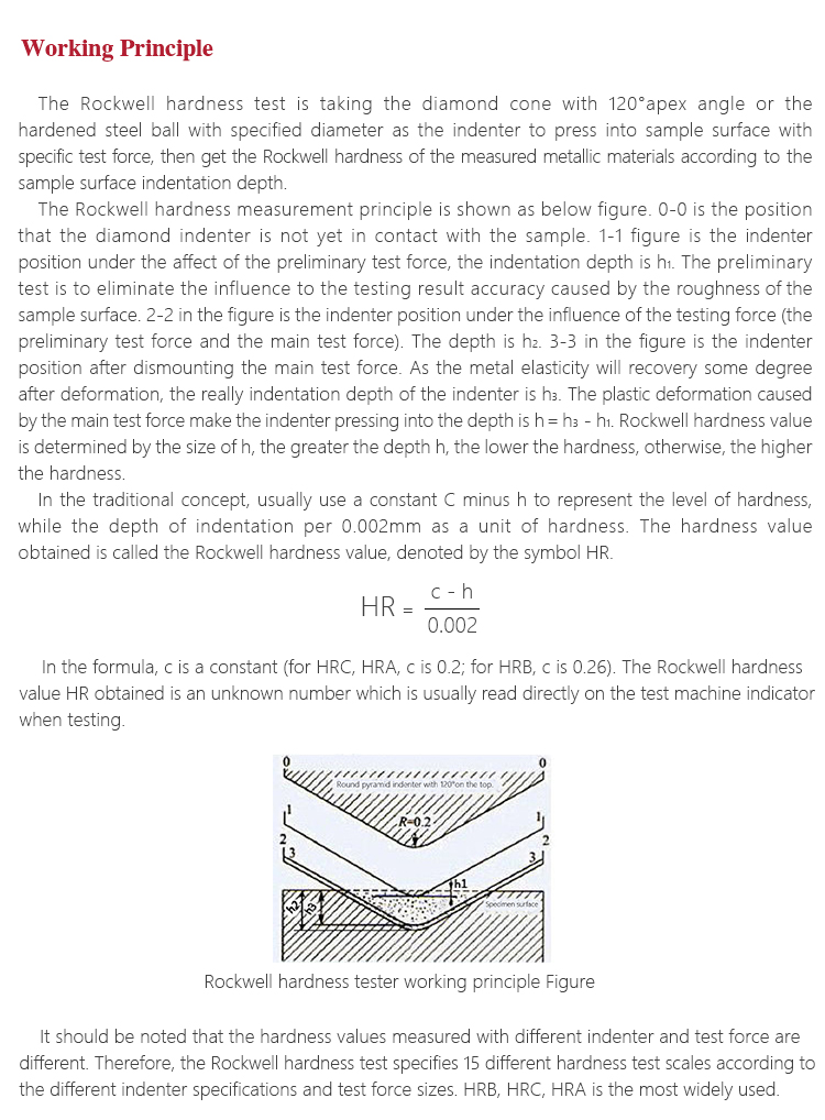 Working PrincipleThe Rockwell hardness test is taking the diamond cone with 120°apex angle or the hardened steel ball with specified diameter as the indenter to press into sample surface with specific test force, then get the Rockwell hardness of the measured metallic materials according to the sample surface indentation depth.