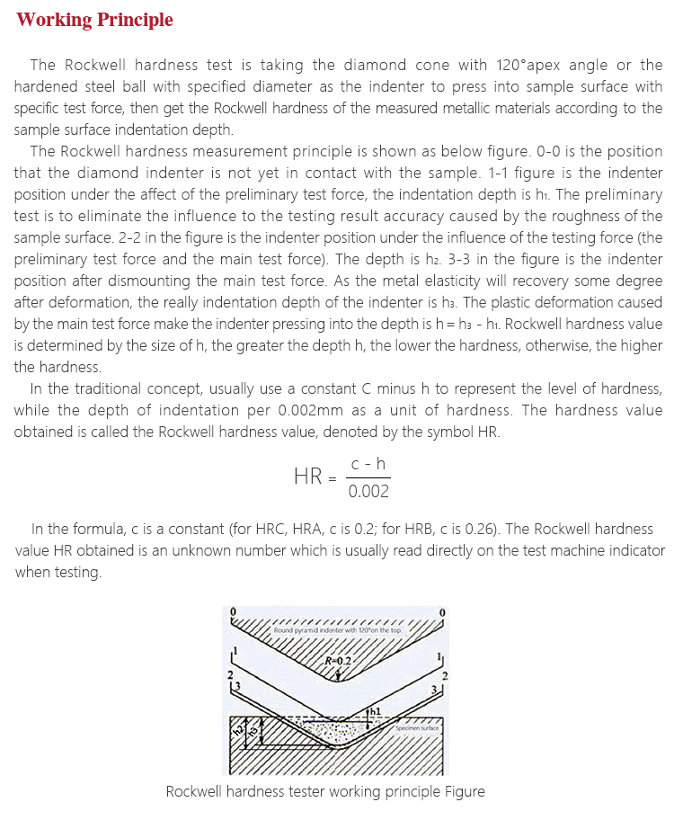 Working PrincipleThe Rockwell hardness test is taking the diamond cone with 120°apex angle or the hardened steel ball with specified diameter as the indenter to press into sample surface with specific test force, then get the Rockwell hardness of the measured metallic materials according to the sample surface indentation depth.