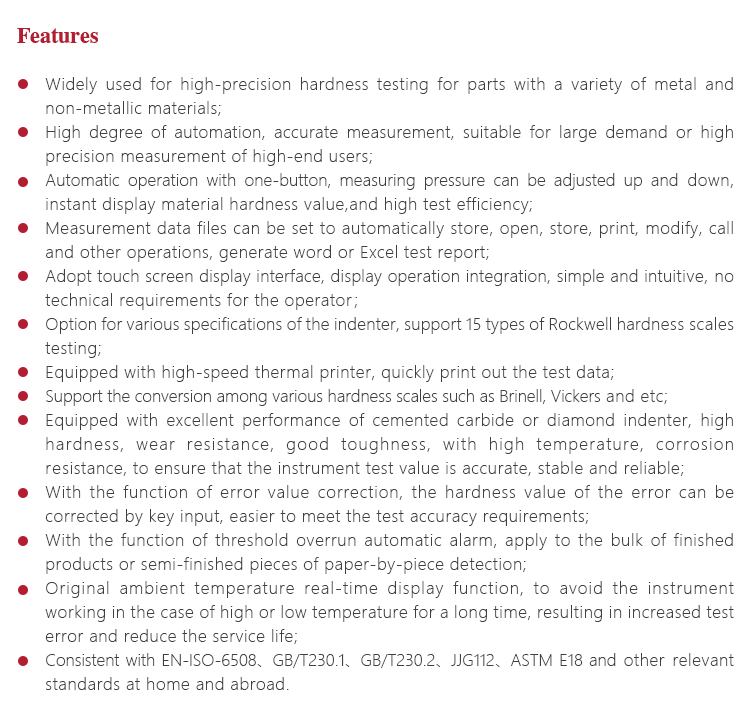 l Consistent with EN-ISO-6508、GB/T230.1、GB/T230.2、JJG112、ASTM E18 and other relevant standards at home and