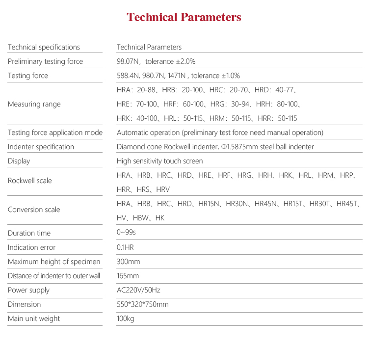 | Indentor specification | Diamond cone Rockwell indenter, Φ1.5875mm steel ball indenter |