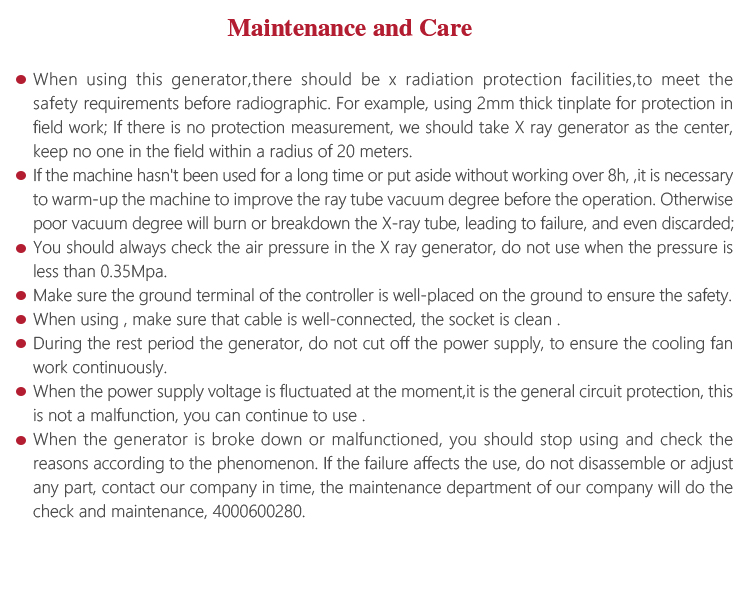When using this generator there should be x radiation protection facilities. For example, using 2mm thick tinplate forprotection. If there is no protection measurement, we should take X ray generator as the center, keep no one in the field within a radius of 20 meters. Meet the safety requirements before radiographic.