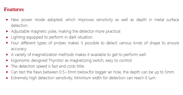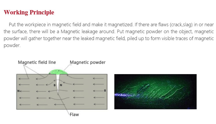 Working PrincipleMagnetizing, put the workpiece in the magnetic field, connect electric to make it magnetized, if there are flaws(crack,slag), magnetic-curve will leakage on the flaws, when put magnetic participle on the workpiece, the magnetic field will catch the participle and pile up
