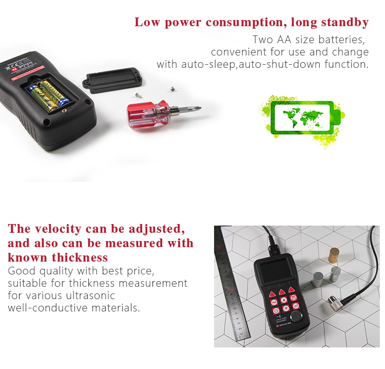 Mitech series ultrasonic thickness gauges, with low-power design and long standby, MT150/MT160/MT200/MT180/MT190/MT600/MT660 are with two AA size alkaline batteries for power supply, easy to replace.