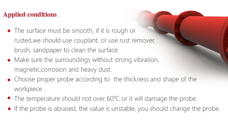 The velocity of sound through a substance is dependant upon its temperature. As materials heat up, the velocity of sound through them decreases. In most applications with surface temperatures less than about 100℃, no special procedures must be observed. At temperatures above this point, the change in sound velocity of the material being measured starts to have a noticeable effect upon ultrasonic measurement. At such elevated temperatures, it is recommended that the user perform a calibration procedure on a sample piece of known thickness, which is at or near the temperature of the material to be measured. This will allow the gauge to correctly calculate the velocity of sound through the hot material.