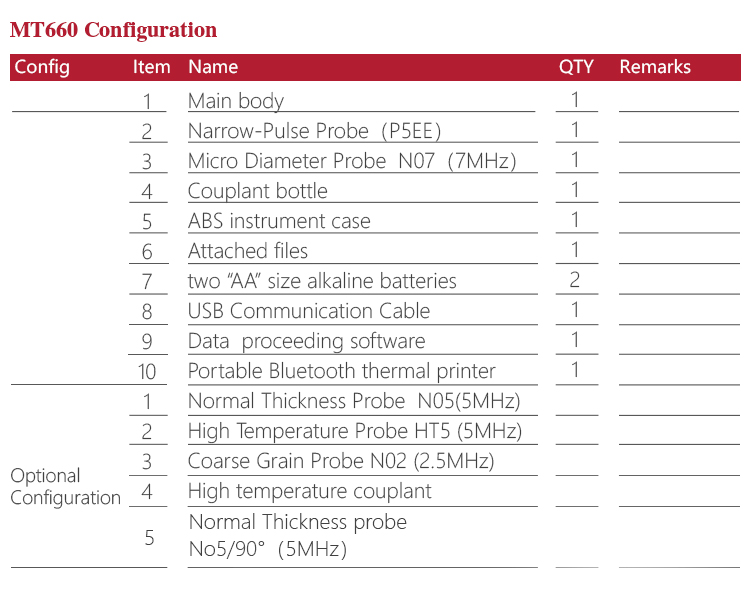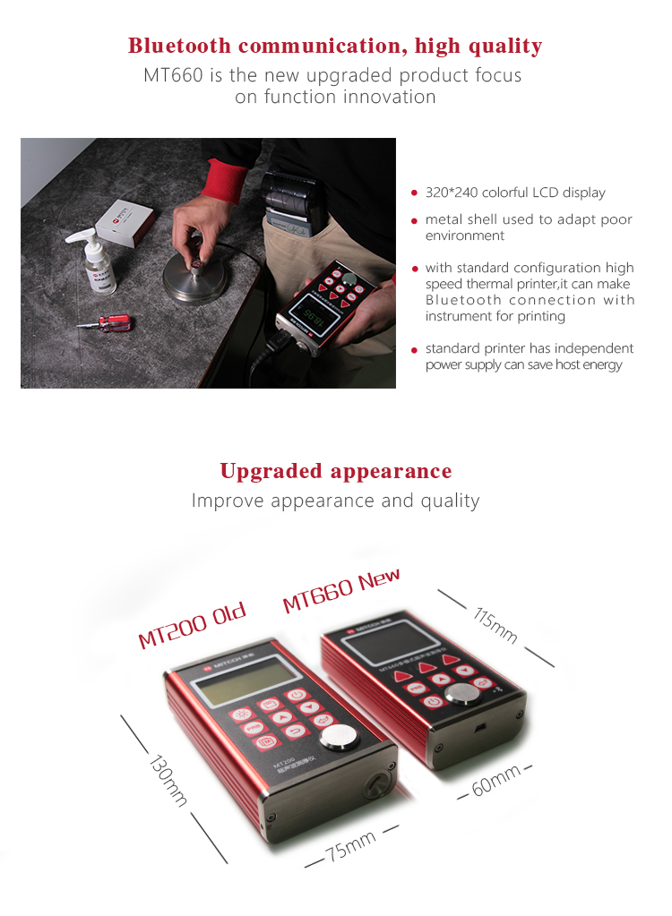 Product OverviewMT660 multi-mode ultrasonic thickness gauge is the newest promoted upgraded product by Mitech. It pays more attention to user experience and functional innovation. Adopted with 320*240 colorful LCD display, it can show you clear measurement result under dim light and strong sunshine environment, improved the visual experience greatly. Sealed aluminum-magnesium alloy case delicate design, smaller volume, better quality are specially designed for defense against oil, dust in the bad sit environment. With intelligent warning function, it will promote automatically when beyond the setting range, it is convenient for reading. It can meet the efficient collecting material’s multiple points’ thickness accurate testing demand. It supports 0.001 high accuracy display and Bluetooth communication. With through coating mode and common mode, its unique performance of capable for testing thickness through the coating provides efficient solution for testing the workpiece of coated surface or corrosion materials. It can measure the workpiece directly without needing to get rid of the surface coating before measurement. It’s widely used for monitoring the production equipments’ various pipelines and pressure vessel corrosion reducing degree in the fields of petroleum, chemical, metallurgy, shipbuilding, aviation, aerospace and so on. It also can be used for making accurate measurement to various plates and machining parts. It is the necessary professional precision instrument for improving the production efficiency and qualification rate as well as saving cost.