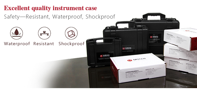 The instrument case of Mitech ultrasonic thickness gauge, length: 27cm, width: 22.5cm, height: 7.5cm and weight: 0.698kg, designed with ABS engineering plastic, It has excellent performance like waterproof, shockproof, excellent heat resistance and low temperature resistance. It can effectively prevent oil, dust and corrosion in harsh environment. Its size in line with the standards for aviation and train carrying (capable of putting under the seat and on the luggage rack), it is safe, reliable and stable.