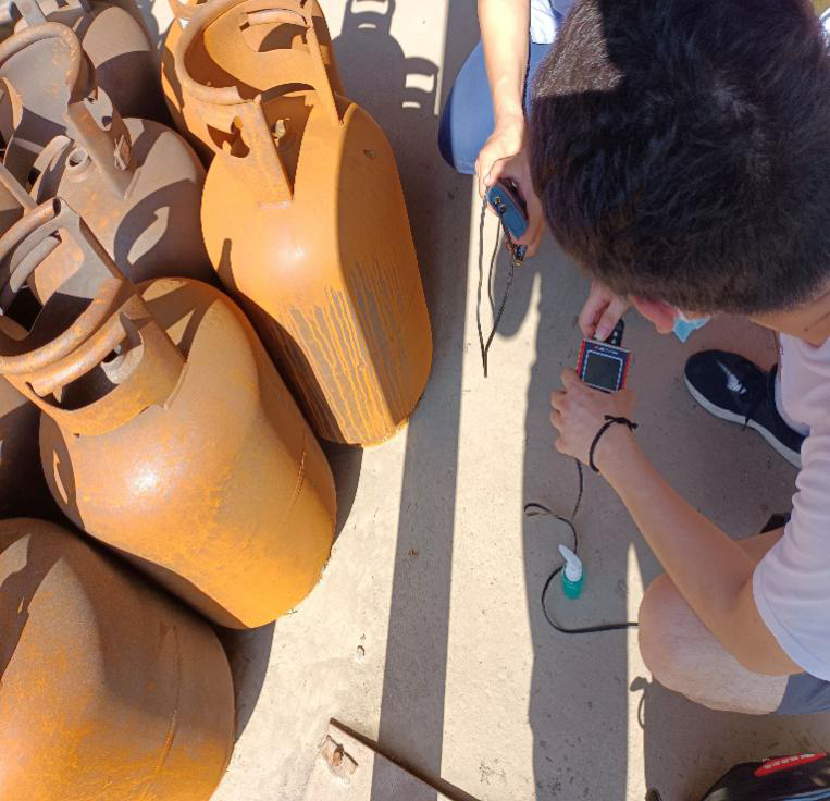 該單位為國企,是北京最大的液化氣罐維修廠。產(chǎn)品質(zhì)量關(guān)乎著千萬商家和老百姓的人身財產(chǎn)安全。液化氣罐在除銹和噴涂工藝后,需對成品液化氣罐的壁厚進行四點檢測,確認其達到新國標2.5mm以上的標準。由于液化氣罐表面涂有油漆層,需要選用可穿透涂層的P5EE測厚探頭,并將測厚儀調(diào)至EE模式進行測厚。操作步驟為:首先在普通模式下進行零點校準,之后調(diào)至EE可穿透模式對成品液化氣罐加工成品進行測量。試值精準無誤。