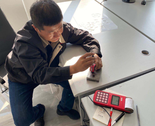 隨后美泰工程師隨李工來到工廠對現(xiàn)場工件做硬度及缺陷檢測,在現(xiàn)場美泰工程師使用里氏硬度計MH500對現(xiàn)場工件進行了硬度測試,最終顯示數(shù)值也十分穩(wěn)定,并且MH500里氏硬度計支持現(xiàn)場打印測量結(jié)果更便于數(shù)據(jù)留存記錄。