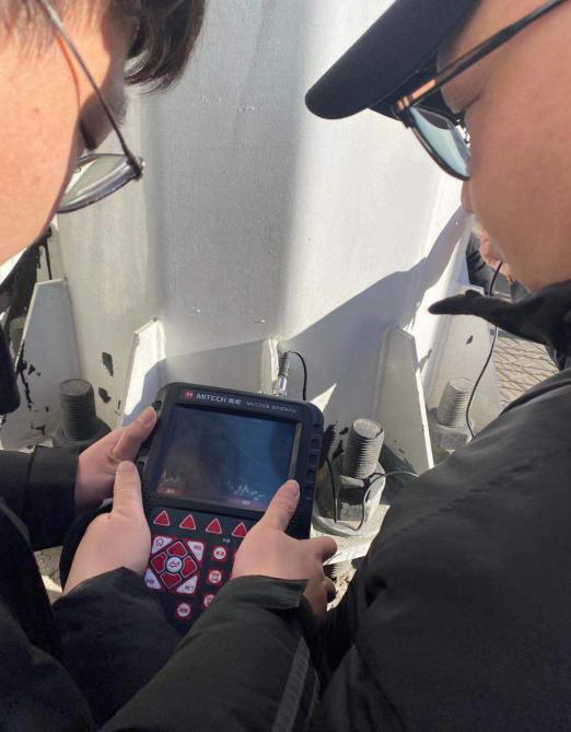 美泰工程師先使用超聲波探傷儀進行內(nèi)部缺陷檢測,當(dāng)天現(xiàn)場溫度較低,達到零下17℃,事先準備的耦合劑洗滌精,在使用過程中,短短幾秒就被凍結(jié),現(xiàn)場人員又購買了食用油用作耦合。雖然現(xiàn)場溫度較低,但是在更換耦合劑之后,檢測效果別沒有受到影響,儀器波形顯示靈敏且清晰?,F(xiàn)場檢測效果十分理想,美泰科儀高智能超聲波探傷儀MUT550B在北方極冷惡劣情況下無任何不良反應(yīng)。