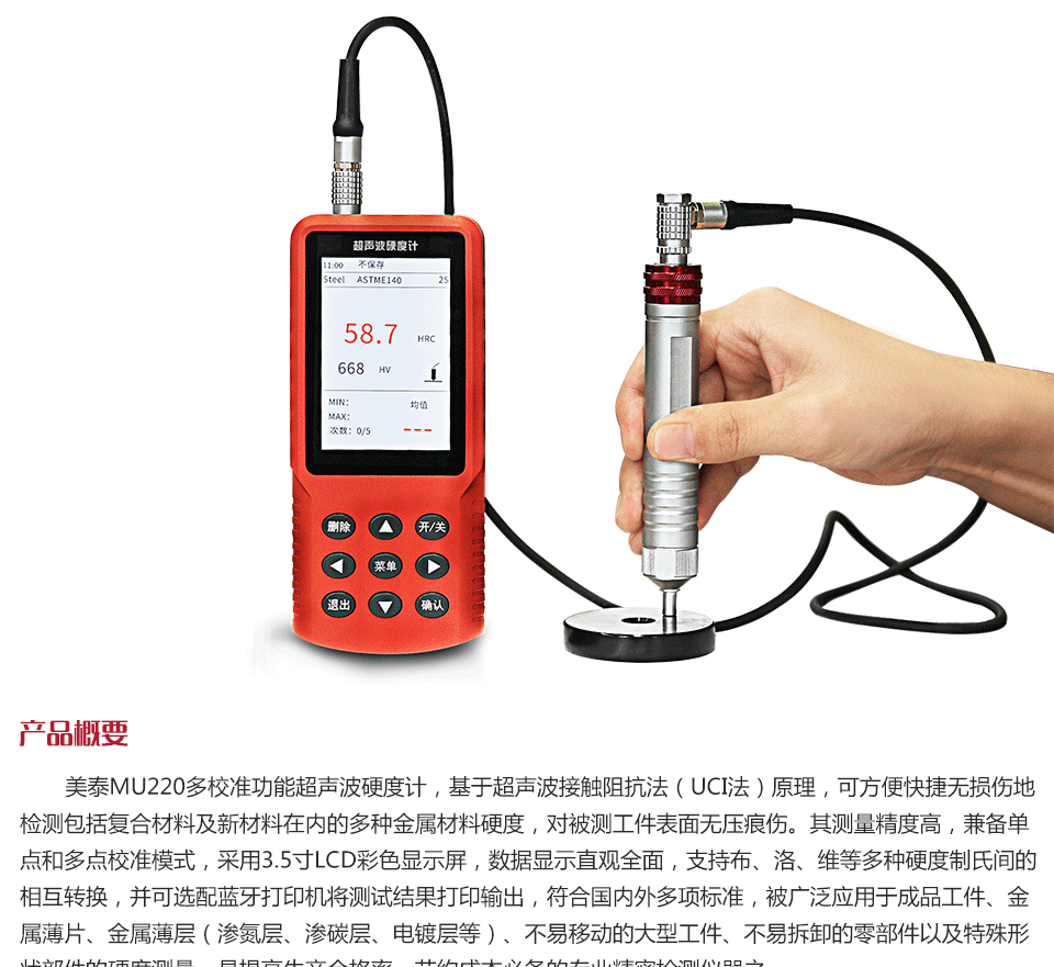 產(chǎn)品概述 美泰MU220多校準(zhǔn)功能超聲波硬度計(jì),基于超聲波接觸阻抗法(UCI法)原理,可方便快捷無損傷地檢測包括復(fù)合材料及新材料在內(nèi)的多種金屬材料硬度,對被測工件表面無壓痕傷。其測量精度高,兼?zhèn)鋯吸c(diǎn)和多點(diǎn)校準(zhǔn)模式,采用3.5寸LCD彩色顯示屏,數(shù)據(jù)顯示直觀全面,支持布、洛、維等多種硬度制氏間的相互轉(zhuǎn)換,并可選配藍(lán)牙打印機(jī)將測試結(jié)果打印輸出,符合國內(nèi)外多項(xiàng)標(biāo)準(zhǔn),被廣泛應(yīng)用于成品工件、金屬薄片、金屬薄層(滲氮層、滲碳層、電鍍層等)、不易移動(dòng)的大型工件、不易拆卸的零部件以及特殊形狀部件的硬度測量,是提高生產(chǎn)合格率、節(jié)約成本必備的專業(yè)精密檢測儀器之一。