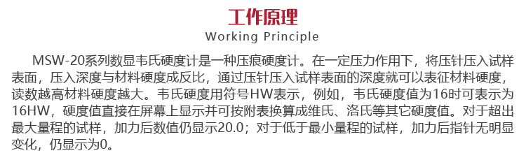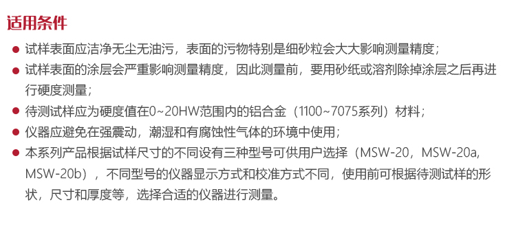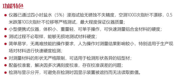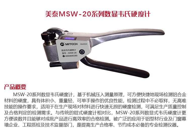產(chǎn)品概述MSW-20系列數(shù)顯韋氏硬度計,分為MSW-20、MSW-20a、MSW-20b三種型號,它們體積小、重量輕、可單手操作,檢測過程中不必取樣,無高難技能的操作要求,適用于在生產(chǎn)現(xiàn)場對材料進行快速無損的硬度檢測。與傳統(tǒng)鉗式硬度計相對比,數(shù)字顯示更方便讀數(shù)??蓾M足生產(chǎn)質(zhì)量控制及合格判定的檢測需求,對成批產(chǎn)品進行逐件檢測。被廣泛的應(yīng)用于鋁型材行業(yè)及諸多門窗幕墻企業(yè)、工程質(zhì)檢及技術(shù)監(jiān)督部門,是提高生產(chǎn)合格率、節(jié)約成本必備的專業(yè)儀器。