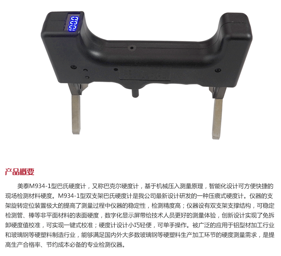 美泰M934-1型巴氏硬度計(jì),又稱巴克爾硬度計(jì),基于機(jī)械壓入測量原理,智能化設(shè)計(jì)可方便快捷的現(xiàn)場檢測材料硬度。M934-1型雙支架巴氏硬度計(jì)是我公司最新設(shè)計(jì)研發(fā)的一種壓痕式硬度計(jì)。儀器的支架旋轉(zhuǎn)定位裝置極大的提高了測量過程中儀器的穩(wěn)定性,檢測精度高;儀器設(shè)有雙支架支撐結(jié)構(gòu),可穩(wěn)定檢測管、棒等非平面材料的表面硬度,數(shù)字化顯示屏帶給技術(shù)人員更好的測量體驗(yàn),創(chuàng)新設(shè)計(jì)實(shí)現(xiàn)了免拆卸硬度值校準(zhǔn),可實(shí)現(xiàn)一鍵式校準(zhǔn);硬度計(jì)設(shè)計(jì)小巧輕便,可單手操作。被廣泛的應(yīng)用于鋁型材加工行業(yè)和玻璃鋼等硬塑料制造行業(yè),能夠滿足國內(nèi)外大多數(shù)玻璃鋼等硬塑料生產(chǎn)加工環(huán)節(jié)的硬度測量需求,是提高生產(chǎn)合格率、節(jié)約成本必備的專業(yè)檢測儀器。