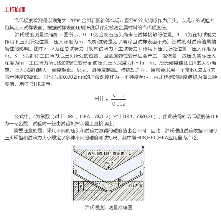 洛氏硬度測量原理如下圖所示,0-0為金剛石壓頭尚未與試樣接觸的位置。1-1為在初試驗(yàn)力作用下壓頭所處位置,壓入深度為h1,初始試驗(yàn)是為了消除因試樣表面不光潔造成的對試驗(yàn)結(jié)果精確性的影響。圖中2-2為在總試驗(yàn)力(初始試驗(yàn)力+主試驗(yàn)力)作用下壓頭所處位置,壓入深度為h2。3-3為卸除主試驗(yàn)力后壓頭所處的位置,因金屬彈性變形后會產(chǎn)生一定恢復(fù),故壓頭實(shí)際壓入深度為h3,主試驗(yàn)力所引起的塑性變形而使壓頭壓入深度為h=h3-h(huán)1。洛氏硬度值即由h的大小確定,壓入深度h越大,硬度越低;反之,則硬度越高。傳統(tǒng)觀念中,通常會采用一個(gè)常數(shù)c減去h來表示硬度的高低,同時(shí)以每0.002mm的壓痕深度作為一個(gè)硬度單位。由此獲得的硬度值稱為洛氏硬度值,用符號HR表示。