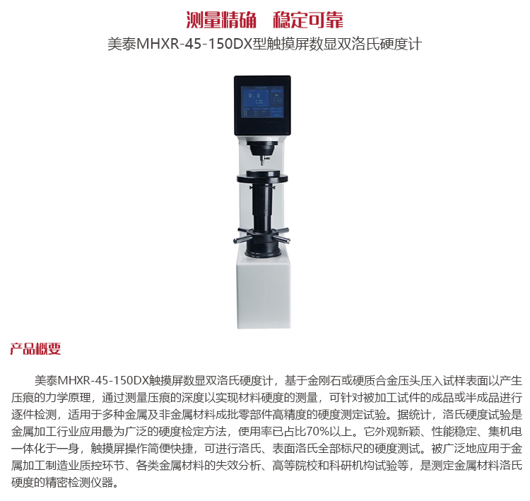 美泰MHXR-45-150DX觸摸屏數(shù)顯雙洛氏硬度計(jì),基于金剛石或硬質(zhì)合金壓頭壓入試樣表面以產(chǎn)生壓痕的力學(xué)原理,通過測量壓痕的深度以實(shí)現(xiàn)材料硬度的測量,可針對被加工試件的成品或半成品進(jìn)行逐件檢測,適用于多種金屬及非金屬材料成批零部件高精度的硬度測定試驗(yàn)。據(jù)統(tǒng)計(jì),洛氏硬度試驗(yàn)是金屬加工行業(yè)應(yīng)用最為廣泛的硬度檢定方法,使用率已占比70%以上。它外觀新穎、性能穩(wěn)定、集機(jī)電一體化于一身,觸摸屏操作簡便快捷,可進(jìn)行洛氏、表面洛氏全部標(biāo)尺的硬度測試。被廣泛地應(yīng)用于金屬加工制造業(yè)質(zhì)控環(huán)節(jié)、各類金屬材料的失效分析、高等院校和科研機(jī)構(gòu)試驗(yàn)等,是測定金屬材料洛氏硬度的精密檢測儀器。