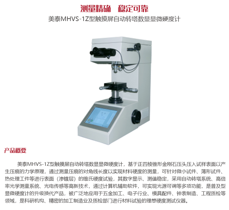 美泰MHVS-1Z型觸摸屏自動(dòng)轉(zhuǎn)塔數(shù)顯顯微硬度計(jì),基于正四棱錐形金剛石壓頭壓入試樣表面以產(chǎn)生壓痕的力學(xué)原理,通過測量壓痕的對(duì)角線長度以實(shí)現(xiàn)材料硬度的測量,可針對(duì)微小試件、薄形試件、熱處理工件等進(jìn)行表面(滲鍍層)的維氏硬度試驗(yàn),其數(shù)字顯示、測值穩(wěn)定,采用自動(dòng)轉(zhuǎn)塔系統(tǒng)、高倍率光學(xué)測量系統(tǒng)、光電傳感等高新技術(shù),通過計(jì)算機(jī)輔助軟件,可實(shí)現(xiàn)光源可調(diào)等多項(xiàng)功能,是普及型顯微硬度計(jì)的升級(jí)換代產(chǎn)品,被廣泛地應(yīng)用于五金加工、電子行業(yè)、模具配件、鐘表制造、工程質(zhì)檢等領(lǐng)域,是科研機(jī)構(gòu)、精密的加工制造業(yè)及質(zhì)檢部門進(jìn)行材料試驗(yàn)的理想硬度測試儀器。