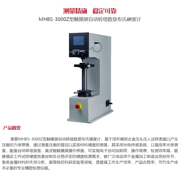 美泰MHBS-3000Z型觸摸屏自動轉塔數(shù)顯布氏硬度計,基于球形硬質(zhì)合金壓頭壓入試樣表面以產(chǎn)生壓痕的力學原理,通過測量壓痕的直徑以實現(xiàn)材料硬度的測量,其采用光電傳感系統(tǒng),以高倍率光學測量,配備自動轉塔裝置、高靈敏觸摸屏操作界面、可實現(xiàn)電子自動加卸荷,操作簡便,檢測效率高,能夠滿足工件試樣硬度質(zhì)量控制及合格評定的硬度檢測需求,被廣泛地應用于金屬加工制造業(yè)質(zhì)控環(huán)節(jié)、各類金屬材料的失效分析、高等院??蒲袑嶒灥阮I域,是提高工作生產(chǎn)效率,產(chǎn)品合格率,節(jié)約生產(chǎn)成本必備的專業(yè)精密檢測儀器。