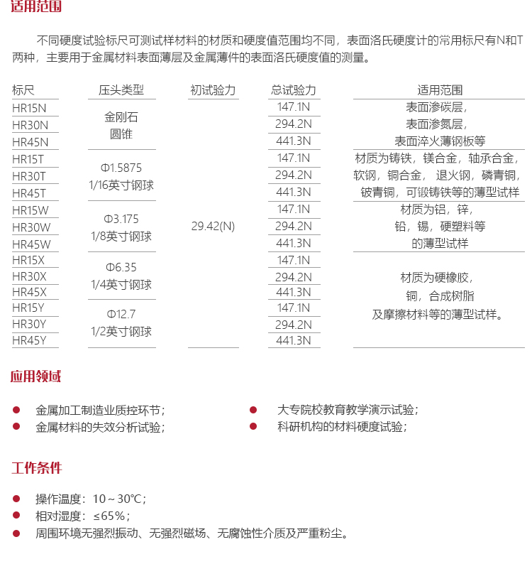 | 洛氏標(biāo)尺 | HR15N、HR30N、HR45N、HR15T、HR30T、HR45T、HR15W、HR30W HR45W、HR15X、HR30X、HR45X、HR15Y、HR30Y、HR45Y |