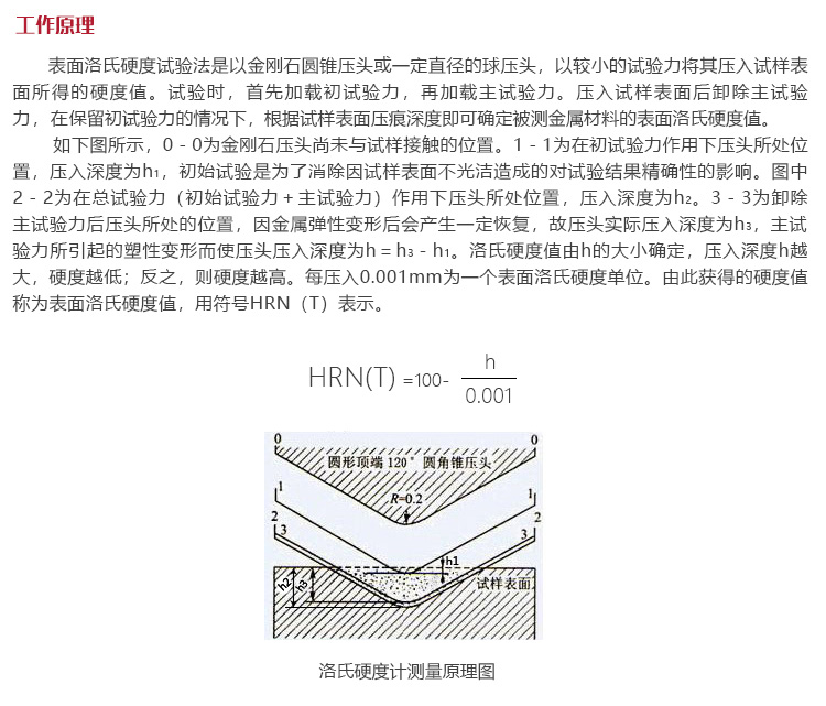 表面洛氏硬度試驗(yàn)法是以金剛石圓錐壓頭或一定直徑的球壓頭,以較小的試驗(yàn)力將其壓入試樣表面所得的硬度值。試驗(yàn)時(shí),首先加載初試驗(yàn)力,再加載主試驗(yàn)力。壓入試樣表面后卸除主試驗(yàn)力,在保留初試驗(yàn)力的情況下,根據(jù)試樣表面壓痕深度即可確定被測(cè)金屬材料的表面洛氏硬度值。