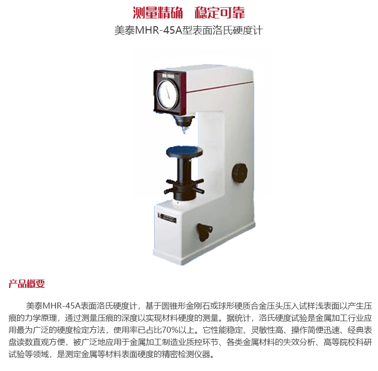 美泰MHR-45A表面洛氏硬度計(jì),基于圓錐形金剛石或球形硬質(zhì)合金壓頭壓入試樣淺表面以產(chǎn)生壓痕的力學(xué)原理,通過(guò)測(cè)量壓痕的深度以實(shí)現(xiàn)材料硬度的測(cè)量。據(jù)統(tǒng)計(jì),洛氏硬度試驗(yàn)是金屬加工行業(yè)應(yīng)用最為廣泛的硬度檢定方法,使用率已占比70%以上。它性能穩(wěn)定、靈敏性高、操作簡(jiǎn)便迅速、經(jīng)典表盤(pán)讀數(shù)直觀方便,被廣泛地應(yīng)用于金屬加工制造業(yè)質(zhì)控環(huán)節(jié)、各類(lèi)金屬材料的失效分析、高等院??蒲性囼?yàn)等領(lǐng)域,是測(cè)定金屬等材料表面硬度的精密檢測(cè)儀器。