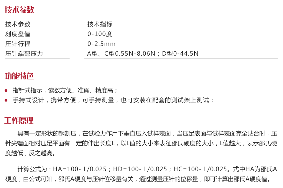 計算公式為: HA=100- L/0.025;HD=100- L/0.025;HC=100- L/0.025。式中HA為邵氏A硬度.由公式可知,邵氏A硬度與壓針位移量有關.通過測量壓針的位移量,即可計算出邵氏A硬度值。