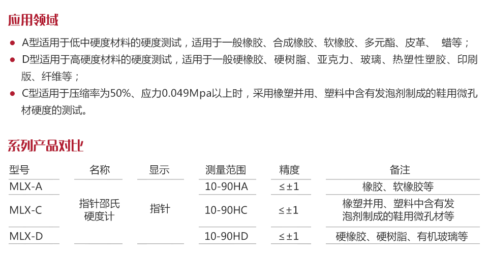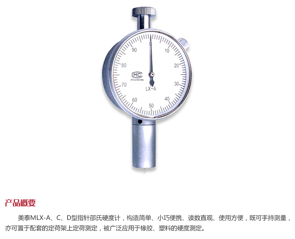 美泰MLX-A、C、D型指針邵氏硬度計,構造簡單、小巧便攜、讀數直觀、使用方便,既可手持測量,亦可置于配套的定荷架上定荷測定,被廣泛應用于橡膠、塑料的硬度測定。