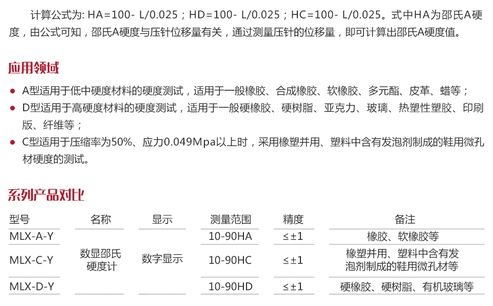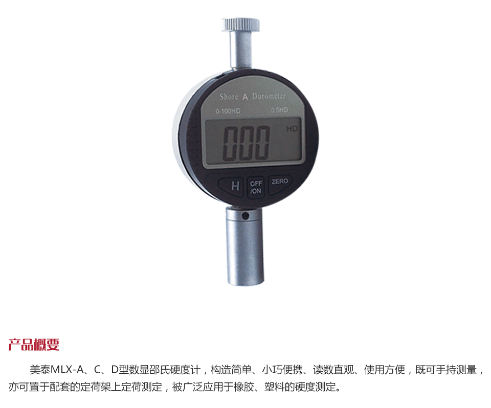 美泰MLX-A、C、D型數(shù)顯邵氏硬度計(jì),構(gòu)造簡單、小巧便攜、讀數(shù)直觀、使用方便,既可手持測量,亦可置于配套的定荷架上定荷測定,被廣泛應(yīng)用于橡膠、塑料的硬度測定。