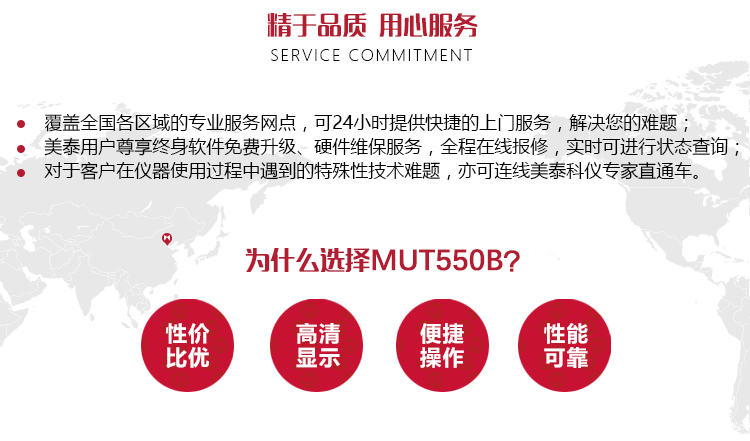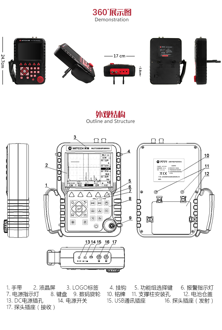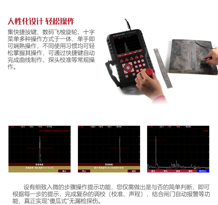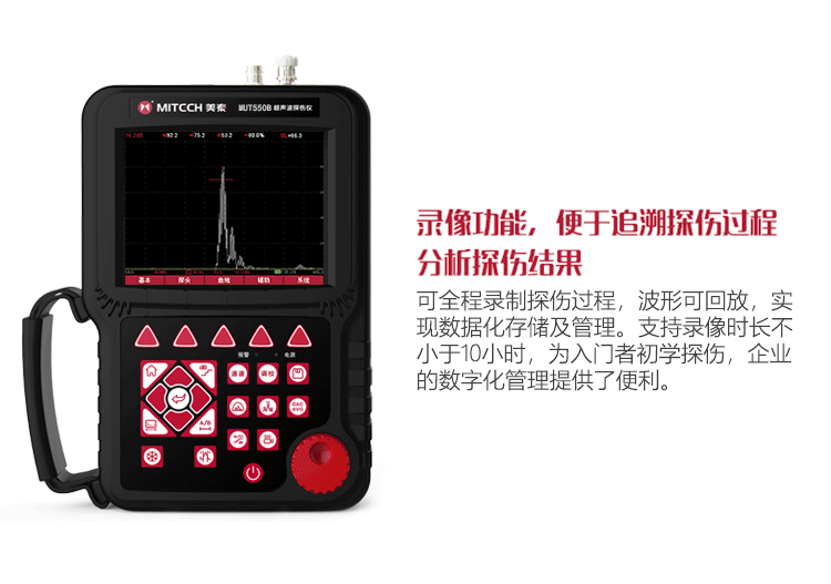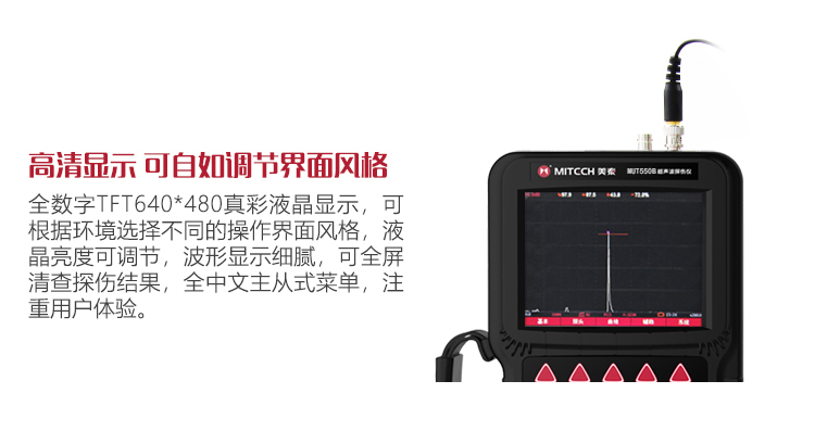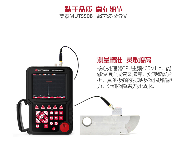 產(chǎn)品概述MUT550B數(shù)字式超聲波探傷儀依據(jù)超聲傳播原理,可精準(zhǔn)、靈敏地進(jìn)行工件內(nèi)部多種缺陷(裂紋、夾雜、氣孔等)的檢測、定位、評估和診斷。采用全數(shù)字TFT640×480真彩色液晶顯示屏,在光線昏暗及日光強(qiáng)烈環(huán)境下都能為您呈現(xiàn)清晰缺陷;0-9999mm大量程可滿足制造業(yè)、鋼鐵冶金業(yè)、金屬加工業(yè)、化工業(yè)等常規(guī)的缺陷檢測需求;低功耗設(shè)計配備大容量高性能鋰離子電池模塊可連續(xù)工作10小時以上;全中文主從式菜單,注重用戶體驗,集快捷按鍵、數(shù)碼飛梭旋輪、十字菜單三種操作方式于一體,不同使用習(xí)慣均可操作自如;設(shè)有綜合性能指標(biāo)自檢功能,可自動生成測試報告,支持多語言。該產(chǎn)品具有很高的性價比,是實(shí)用經(jīng)濟(jì)款超聲檢測儀器的明智之選。