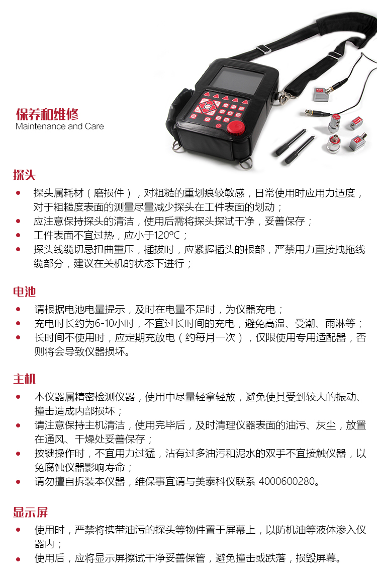 | 美泰標(biāo)準(zhǔn)超聲波探傷儀B系列內(nèi)置電池,電池類型為:鋰電池,電壓:7.2V,電池容量:8800mAh。屬美泰超聲波探傷儀B系列產(chǎn)品的標(biāo)準(zhǔn)配置。使用中,切勿自行拆解電池組;僅限使用本公司提供的專用的電源適配器進(jìn)行充電,否則將會導(dǎo)致電池?fù)p壞,長時間不使用時,應(yīng)定期充放電(約每月一次),防止失效。 | |