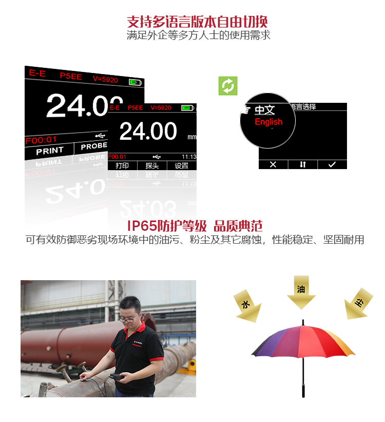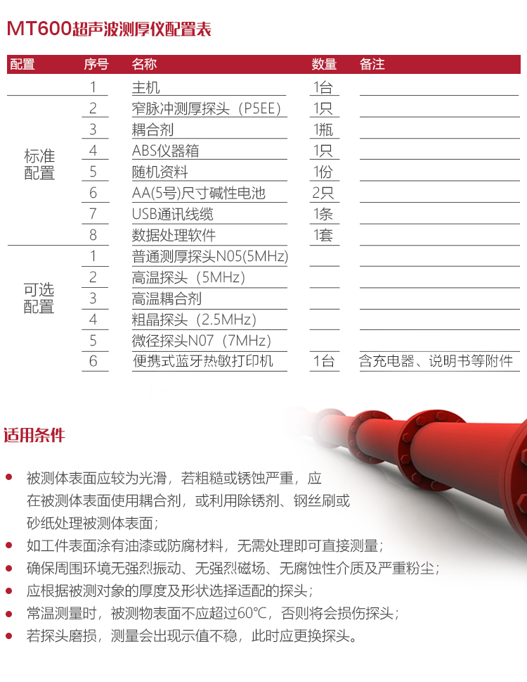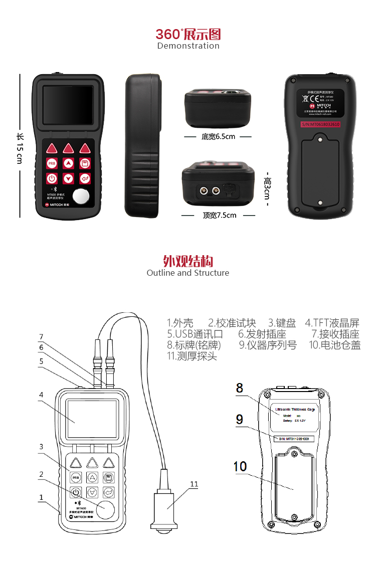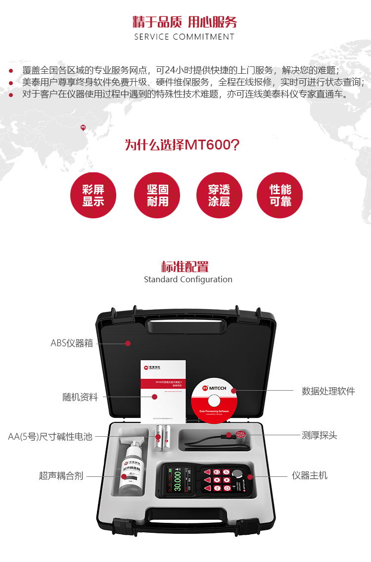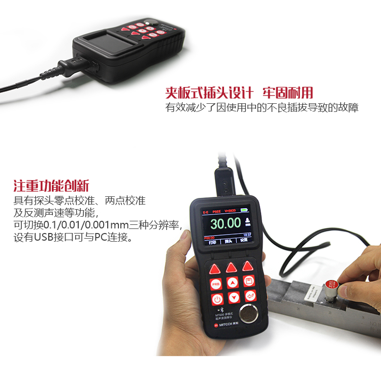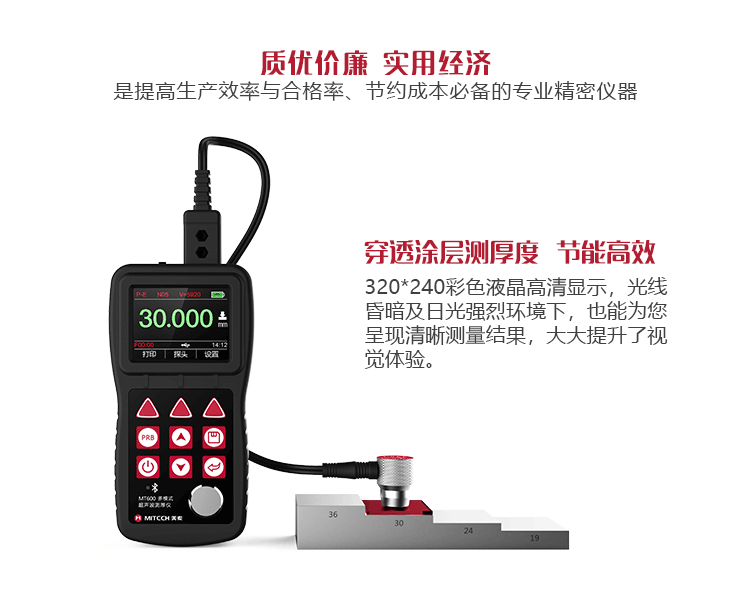 產(chǎn)品概述MT600超聲波測厚儀是美泰公司強(qiáng)力推出的升級(jí)產(chǎn)品,它更加注重用戶體驗(yàn)及功能創(chuàng)新,采用320×240彩色液晶顯示屏,光線昏暗及日光強(qiáng)烈環(huán)境下也能為您呈現(xiàn)清晰測量結(jié)果,大大提升了視覺體驗(yàn),IP65防護(hù)等級(jí),可有效防御惡劣現(xiàn)場環(huán)境中的油污、粉塵及其它腐蝕;創(chuàng)新設(shè)計(jì)的語言播報(bào)測量結(jié)果功能,可方便讀數(shù),超出設(shè)定范圍可自動(dòng)報(bào)警,滿足高效采集材料多點(diǎn)厚度的精準(zhǔn)檢測需求,支持0.001高精度顯示、藍(lán)牙通訊,兼?zhèn)浯┩竿繉幽J脚c普通模式雙效功能,其獨(dú)特的可穿透涂層測厚度的性能為表面涂有油漆或防腐材料的工件厚度檢測提供了更加高效的解決方案,測量前無需處理掉表面的涂層,可直接測量。被廣泛應(yīng)用于石油、化工、冶金、造船、航空、航天等領(lǐng)域的生產(chǎn)設(shè)備中各種管道及壓力容器腐蝕減薄程度的監(jiān)測,也可用于對(duì)各種板材及各種加工零件做精確的測量。是提高生產(chǎn)效率與合格率、節(jié)約成本必備的專業(yè)精密儀器。