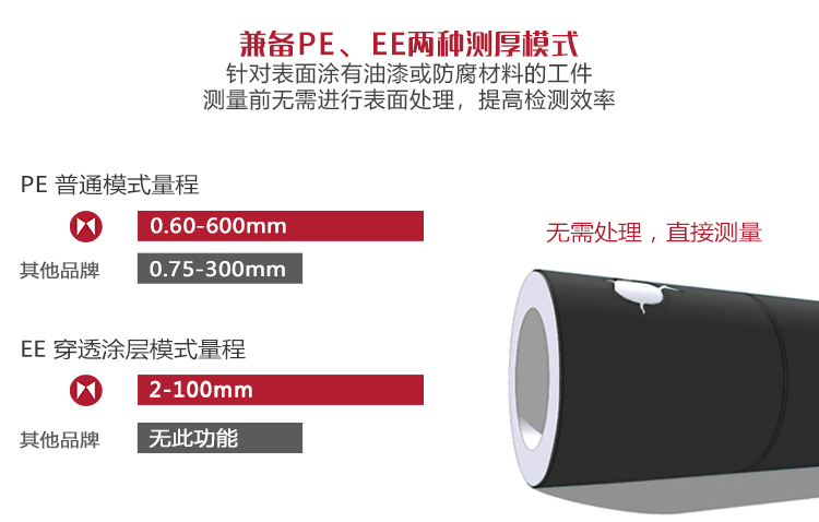 具有兩種測厚模式:發(fā)射-回波模式和回波-回波模式,可以穿透涂層進(jìn)行厚度測量而不計(jì)入涂層厚度
