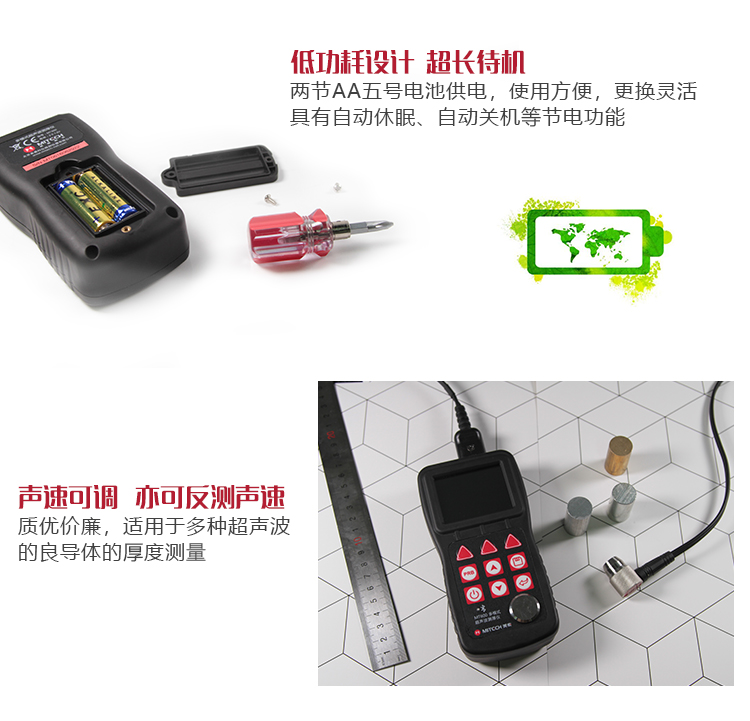 | 美泰系列超聲波測厚儀,均采用低功耗設(shè)計(jì)理念,超長待機(jī),MT150/MT160/MT200/MT180/MT192/MT280/MT600/MT660均由兩節(jié)AA五號(hào)電池供電、更換方便。 | |