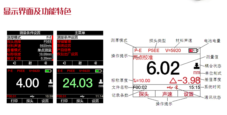 | 測厚模式 | 發(fā)射-回波模式(P-E)和回波-回波(E-E)模式 |