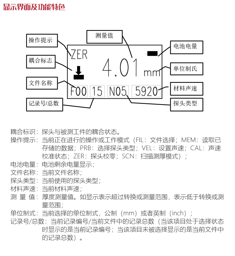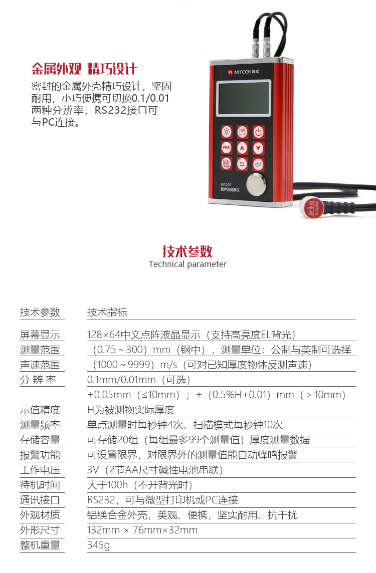 | 測(cè)量范圍 | (0.75~300)mm(鋼中),公制與英制可選擇 |