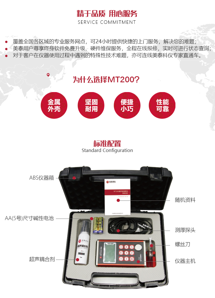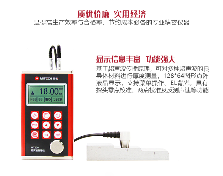 MT200超聲波測(cè)厚儀,基于超聲傳播原理,可對(duì)金屬、塑料、陶瓷、玻璃及其他多種超聲波的良導(dǎo)體材料進(jìn)行厚度測(cè)量,也可實(shí)現(xiàn)對(duì)材料聲速的反測(cè)。密封的金屬外殼精巧設(shè)計(jì),可防御惡劣現(xiàn)場(chǎng)環(huán)境中的油污、粉塵;與傳統(tǒng)的測(cè)量方法相比,超聲波測(cè)厚儀的優(yōu)勢(shì)在于它只要接觸到被測(cè)工件的一面即可完成測(cè)量,其獨(dú)特的無(wú)損檢測(cè)性能為封閉類(lèi)管材、容器等厚度檢測(cè)受局限的工況提供了完美的解決方案,被廣泛應(yīng)用于石油、化工、冶金、造船、航空、航天等領(lǐng)域的生產(chǎn)設(shè)備中各種管道及壓力容器腐蝕減薄程度的監(jiān)測(cè),也可用于對(duì)各種板材及各種加工零件做精確的測(cè)量。